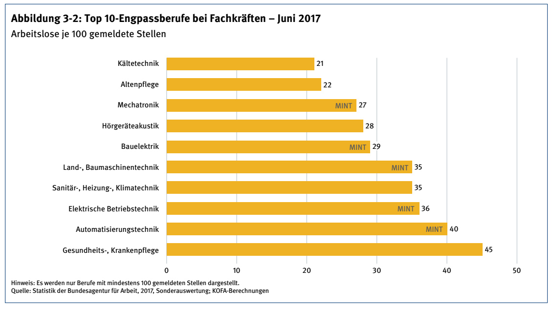 Aber mal zur Definition: Wenn in einem Beruf rein rechnerisch die Zahl der Arbeitslosen nicht ausreicht, um alle offenen Stellen besetzen zu können, dann sprechen Arbeitsmarktexperten von einem Engpass. Das Institut der deutschen Wirtschaft beobachtet regelmäßig die Entwicklung dieser Berufe. Dazu erscheint jedes halbe Jahr ein Bericht. Er zeigt, in welchen Bereichen die Situation besonders angespannt ist.