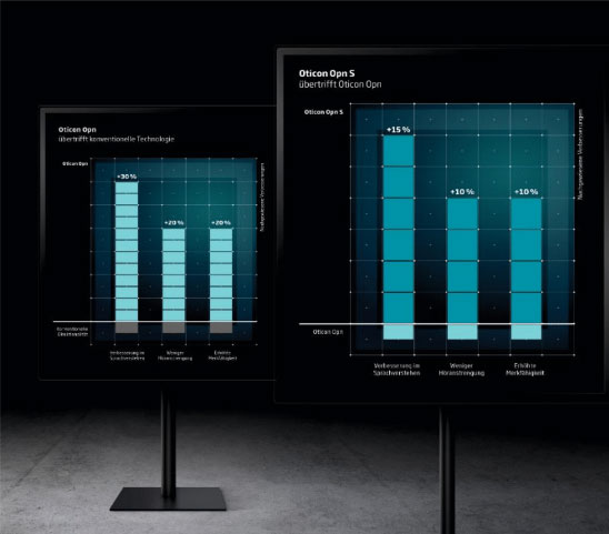 Dank der kontinuierlichen Weiterentwicklung des OpenSound Navigators™, ist mit Oticon Opn S jetzt eine noch individuellere Personalisierung der 360°-Klanglandschaft möglich. In Kombination mit dem einzigartigen OpenSound Optimizer™ hebt das Premium-Hörsystem BrainHearing™ jetzt auf die nächste Stufe. Im Vergleich zum vorherigen Modell Oticon Opn™ kann Oticon Opn S mit zusätzlich 15 Prozent mehr Sprachverstehen überzeugen, die Merkfähigkeit um zehn Prozent erhöhen und das alles bei zehn Prozent weniger Höranstrengung. Diese nachgewiesenen Verbesserungen schließen eine weitere Lücke zu Normalhörenden: Studien belegen, dass Oticon Opn S Schwerhörigen ermöglicht, in akustisch schwierigen Situationen, wie z. B. in einem Restaurant, wie gleichaltrige Normalhörende zu verstehen.[1]