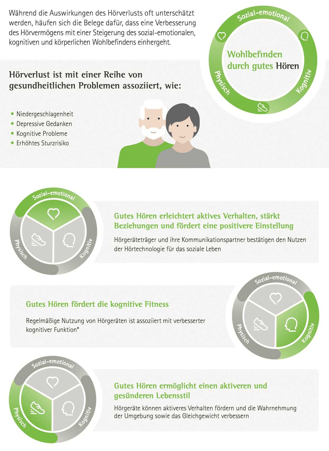 Ein möglicher Zusammenhang zwischen Hören und Wohlbefinden wird schon lange in der Fachwelt diskutiert. Eine Auswertung relevanter Studien im Auftrag des Hörgeräteherstellers Phonak kam zu dem Ergebnis, dass die Behandlung von Hörproblemen maßgeblich zu einem gesteigerten Wohlbefinden bei Menschen führt. Ein Hörverlust bedeutet für Betroffene mehr als eine reine Einschränkung des Hörvermögens.