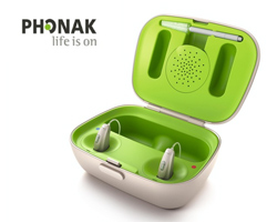 Mit dem Hörgerät Audéo B90- R führt Phonak das erste wiederaufladbare Hörgerät ein. Neu ist, dass erstmalig in der Hörgerätegeschichte ein Lithium-Ionen-Akku verwendet wird. Lithium-Ionen-Akkus sind langlebig und besitzen eine, um 40% höhere Leistungsfähigkeit wie herkömliche Batterien. Mit nur 3h Ladezeit im Phonak Charger-Case oder im Phonak Mini-Case ist ein eine Laufzeit der Hörgeräte von bis zu 24h möglich. Selbst ein Kurzladeverfahren von 30min ermöglicht einen Betrieb von bis zu 6h. Ein optional erhältlicher Power-Pack kann unterwegs für eine schnelle Aufladung der Hörgeräte sorgen und das bis zu sieben Mal. Der fest verbaute Akku erhöht zusammen mit seiner Langlebigkeit von 5-6 Jahren den Hörgerätekomfort für den Nutzer ungemein. Ist der Akku leer, ertönt ein Signalton in den Hörgeräten, so dass diese aufgeladen werden müssen. Das Aufladen geschieht bequem in einer mitgelieferten Ladestation. Hier werden die Hörgeräte elektrisch, über im Batteriefach verbaute Ladekontakte, aufgeladen. Dabei sind die Ladeschächte so gestaltet, dass sowohl das linke aber auch das rechte Hörgerät geladen werden kann. Ein Vertauschen der Seiten schließt damit das Laden nicht aus.