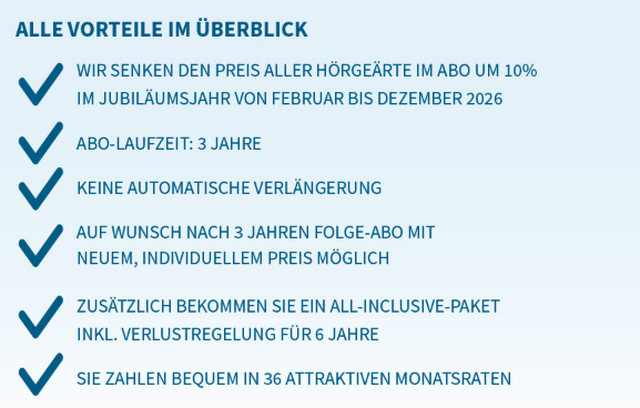 Sie profitieren doppelt: Als Dankeschön an unsere Kundinnen und Kunden senken wir im Jubiläumsjahr ab sofort bis Dezember die Abo-Preise für alle Hörgeräte-Modelle – vom Einsteiger- bis zum Premiumsegment. In allen Filialen. Ohne Ausnahme.